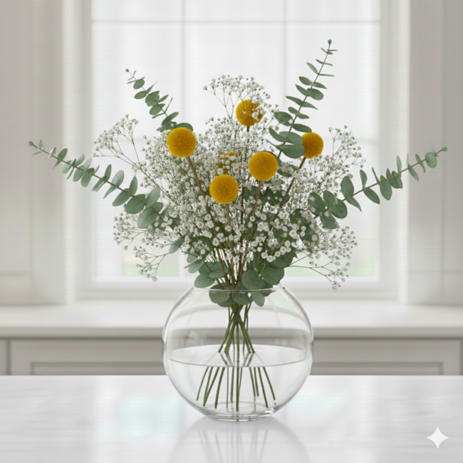 Warum sollten Sie dieses frische DIY-Set wählen? Der Strauß Sophie ist nicht nur atemberaubend schön, sondern macht auch beim Selberarrangieren in Ihrer Lieblingsvase viel Freude. Das Set besteht aus der ikonischen gelben Craspedia, dem herrlich duftenden frischen Eucalyptus Cinerea und luftigem weißen Schleierkraut. Da diese Blumen direkt vom Züchter kommen, genießen Sie optimale Frische und eine lange Haltbarkeit in der Vase.