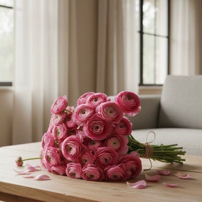 Frische Rosa Ranunkeln: 10 Stiele in Topqualität. Länge ± 40 Zentimeter. Eine romantische, volle Blüte direkt vom Züchter. Sanftheit für Ihr Zuhause! Lesen Sie mehr.