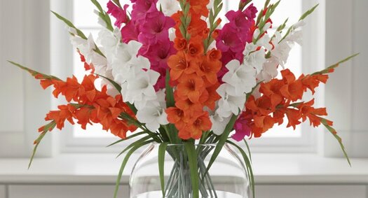 Gladioli are not only beautiful but also relatively easy to maintain. Here are a few tips to ensure your gladioli last long: Fill a clean vase with fresh water and add some flower food. Cut the stems at an angle for better water absorption. Place the vase in a spot without direct sunlight and away from fruit, as ethylene gas can shorten the lifespan of your flowers. Change the water every few days and trim the stems again if necessary.