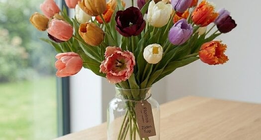 Bring the freshness of spring into your home, all year round, with Florimo silk tulips. The tulip is perhaps the most iconic flower, and our silk versions are recreated with the utmost care to match those vibrant colors and natural shape. At Florimo, you will find a wide range of types, from the classic single tulip to the filled parrot tulip, all executed in the highest quality silk. They are almost indistinguishable from real ones and have a luxurious appearance. Are you looking for a specific color or type of tulip not listed in the Florimo shop? Contact us, we are happy to help you find the perfect match!